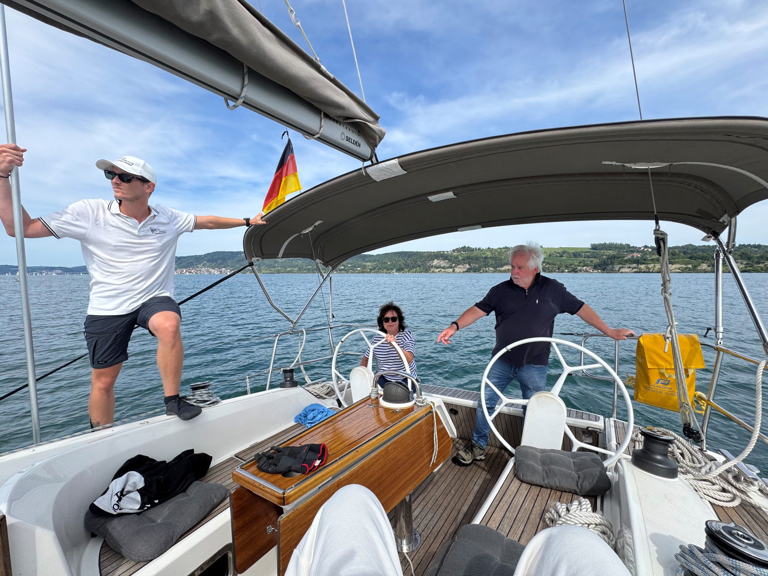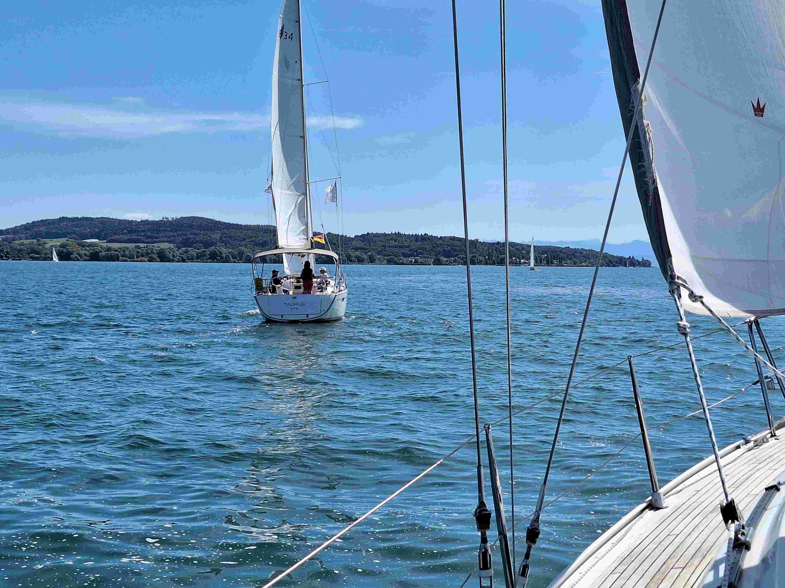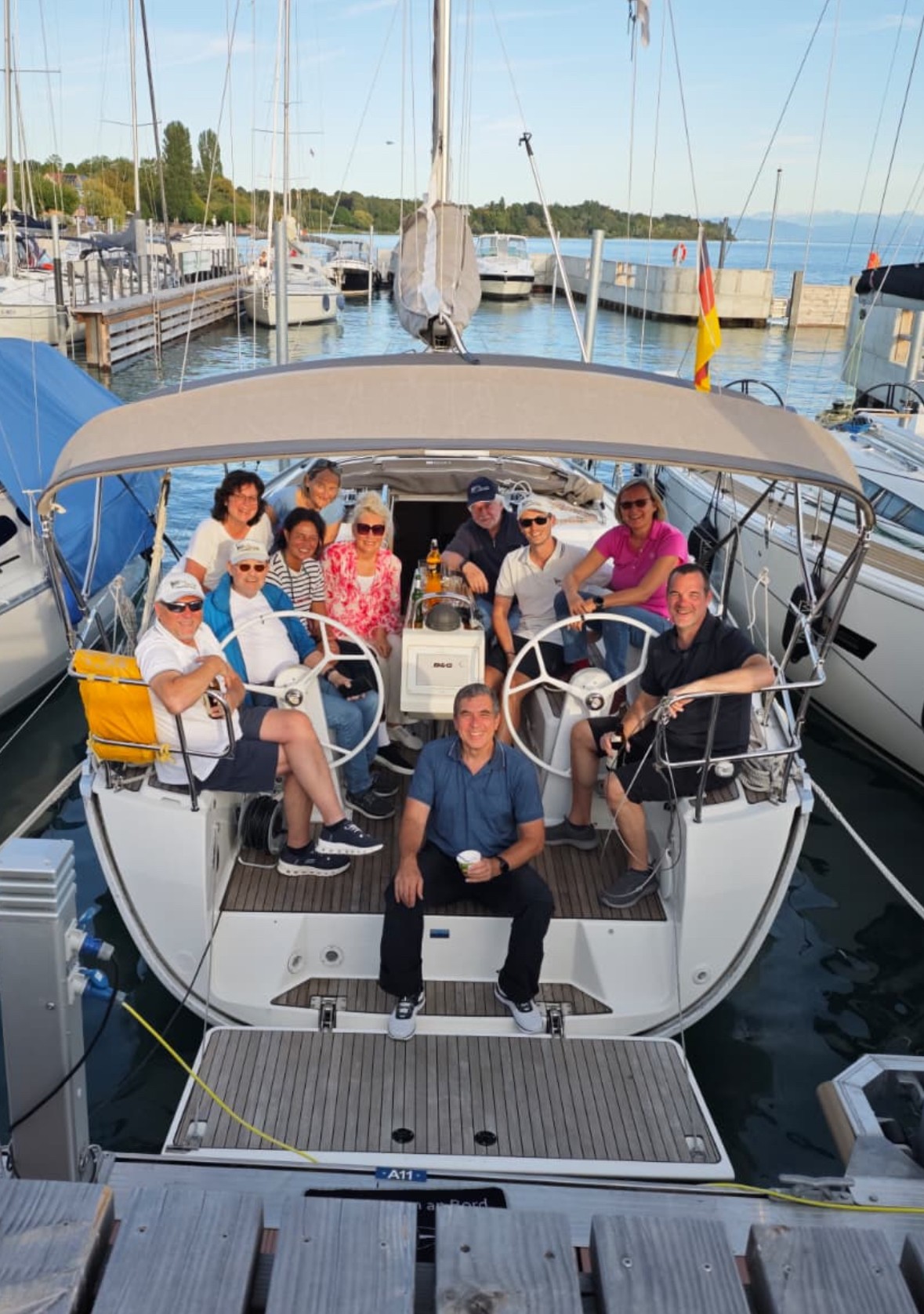 Mit zwei Schiffen mit einer Länge von jeweils 37 Fuß starteten wir in Kressbronn-Gohren vom Ultramarin-Hafen zu unserem Ziel Yachthafen Bregenz. Bei mäßigem Wind ging es dann nach Bregenz, wo wir abends im Wirtshaus am See die netteste Kellnerin vom Bodensee trafen. Auf dem Rückweg am Sonntag hatten wir dann richtig Wind, sodass die Boote auf einem Am-Wind-Kurs auf über 5 kn „beschleunigten“. Ein tolles Wochenende bei gefühlt 24 Stunden Sonnenschein.