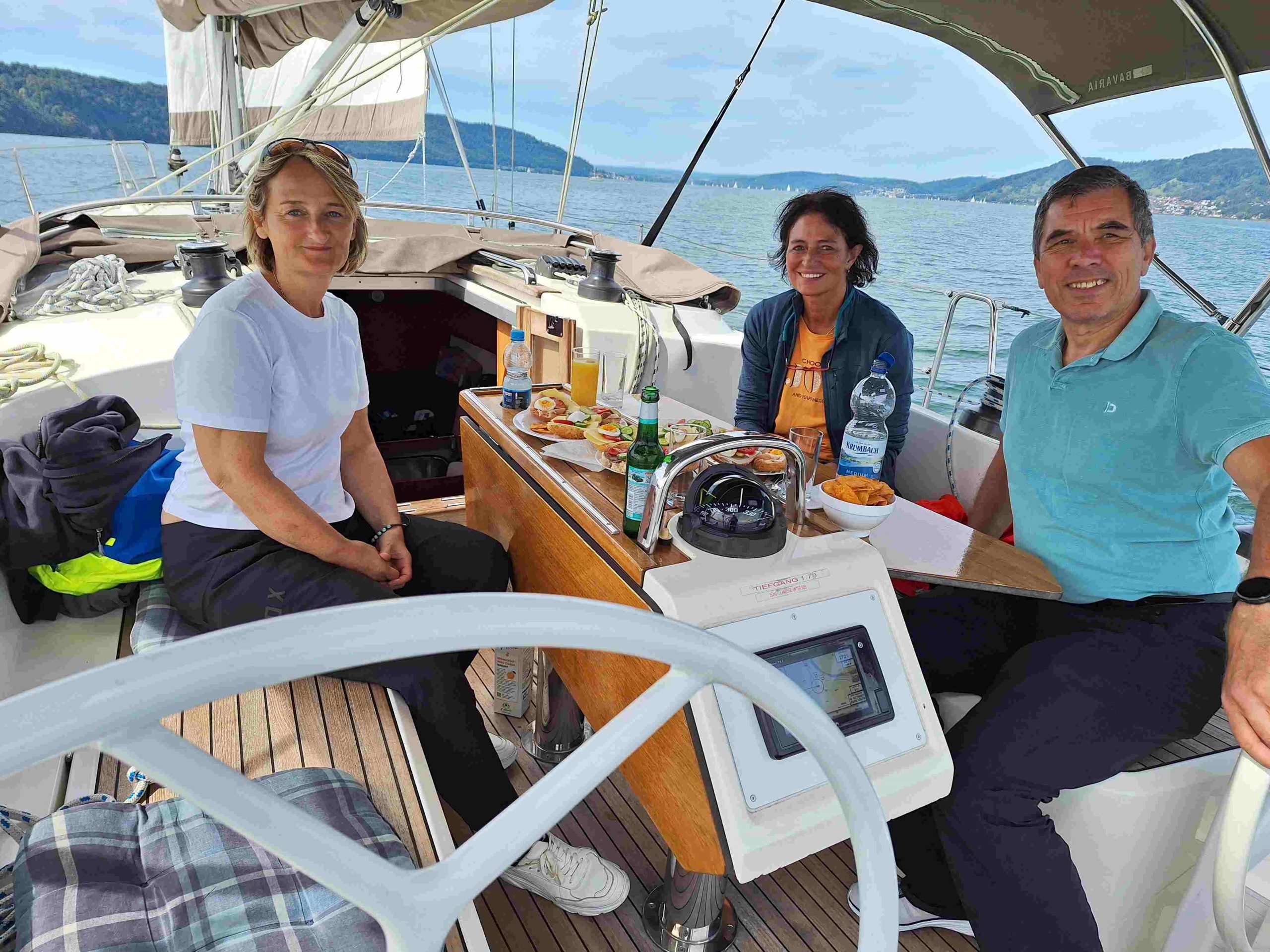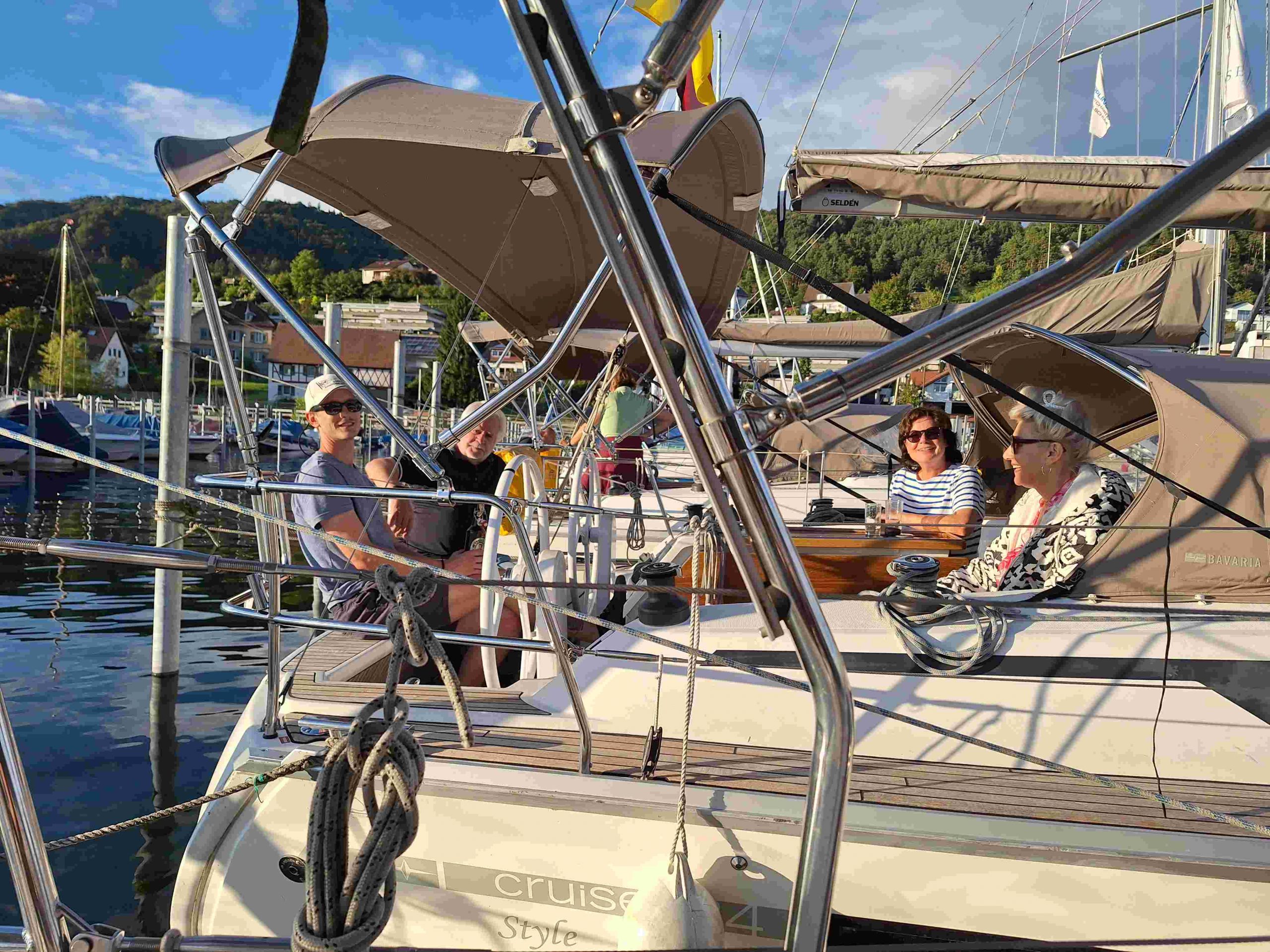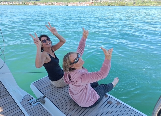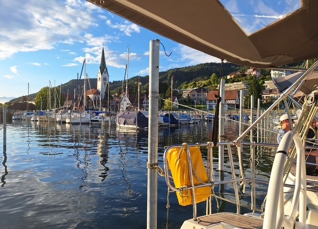 Mit zwei Schiffen mit einer Länge von jeweils 37 Fuß starteten wir in Kressbronn-Gohren vom Ultramarin-Hafen zu unserem Ziel Yachthafen Bregenz. Bei mäßigem Wind ging es dann nach Bregenz, wo wir abends im Wirtshaus am See die netteste Kellnerin vom Bodensee trafen. Auf dem Rückweg am Sonntag hatten wir dann richtig Wind, sodass die Boote auf einem Am-Wind-Kurs auf über 5 kn „beschleunigten“. Ein tolles Wochenende bei gefühlt 24 Stunden Sonnenschein.